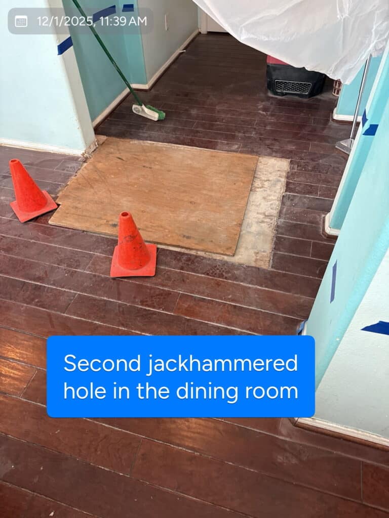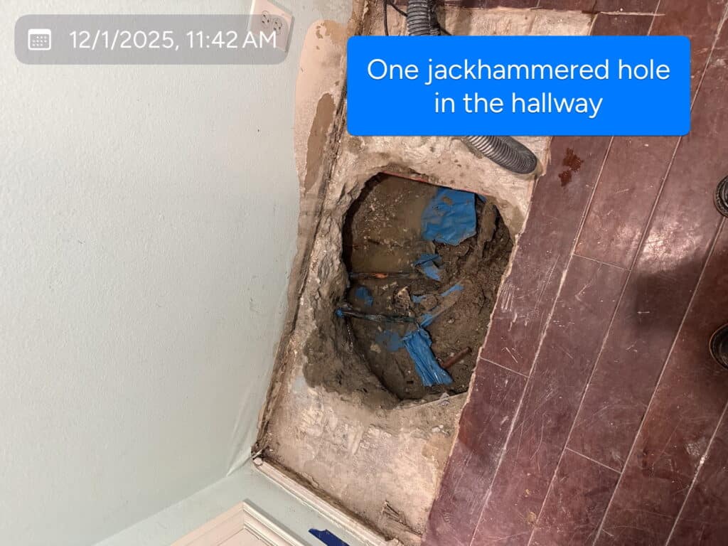 Two large holes had already been jackhammered through finished hardwood flooring and the concrete slab: